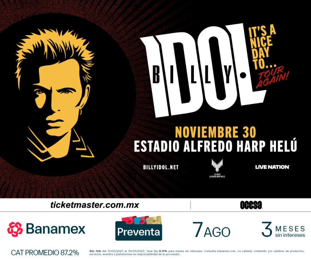 El Estadio Alfredo Harp Helú, con capacidad para más de 20,000 espectadores, será el escenario perfecto para vivir la experiencia única que ofrece Billy Idol en vivo, un show lleno de energía, poderosos riffs y esa actitud inconfundible que solo él puede transmitir.