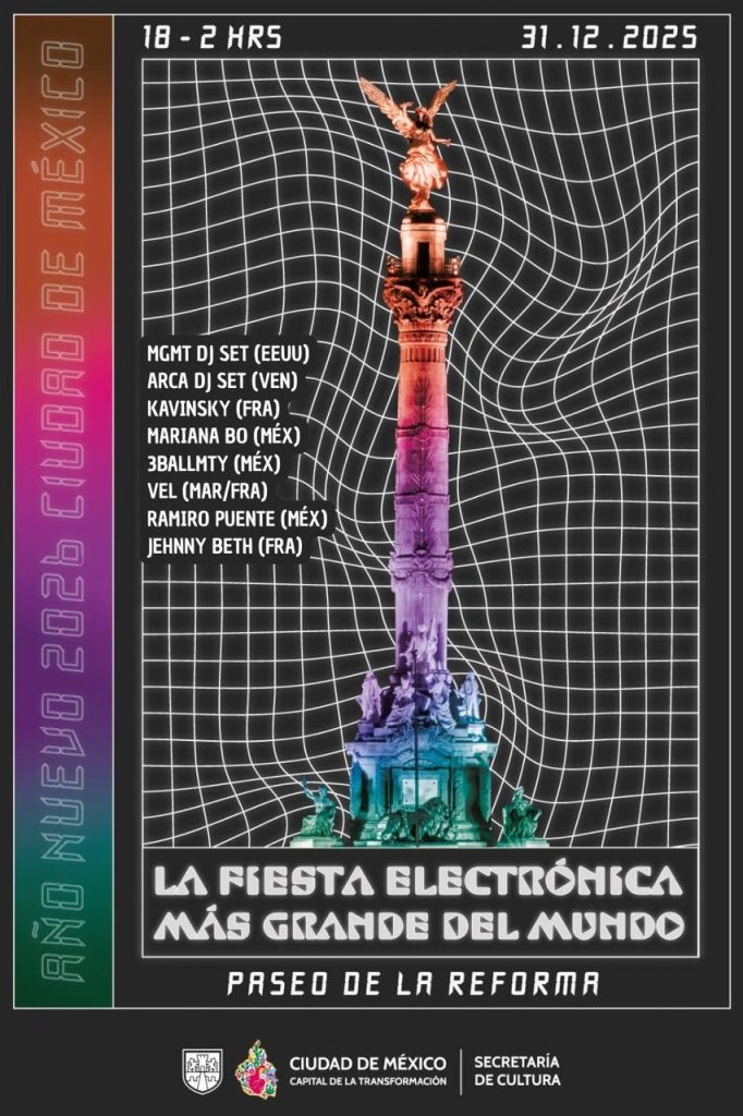 El Gobierno de la Ciudad de México, a través de la Secretaría de Cultura capitalina, invita a celebrar la llegada del Año Nuevo 2026 con “La fiesta electrónica más grande del mundo”, un encuentro musical sin precedentes que transformará la Avenida Paseo de la Reforma en un gran escenario al aire libre para despedir el año y dar la bienvenida al nuevo ciclo con música y baile, el próximo miércoles 31 de diciembre, de 18:00 a 02:00, entrada libre.